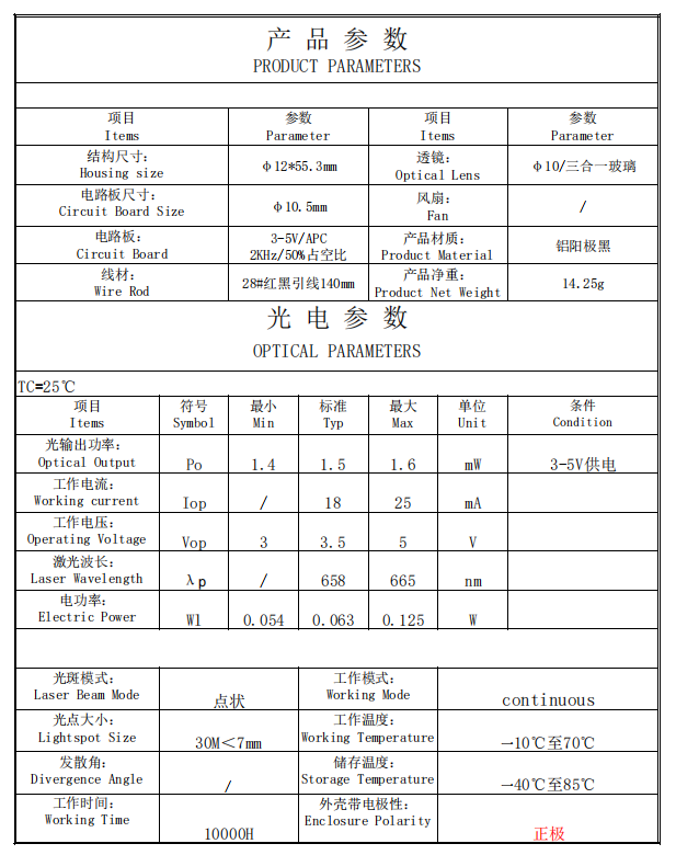This is 650nm 5mW Collimated Red Laser Diode Module with 12mm diameter and can get a collimated beam as 7mm spot size at a 30m working distance. This high-quality laser module is designed for precision aiming and positioning applications.