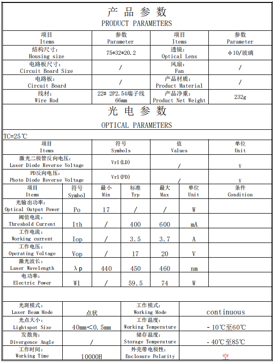 | Single Diode Module Optical Power | 20mW-3W | 55mW-6W | 10mW-1.6W | 5mW-2.5W | 5mW-75W |
