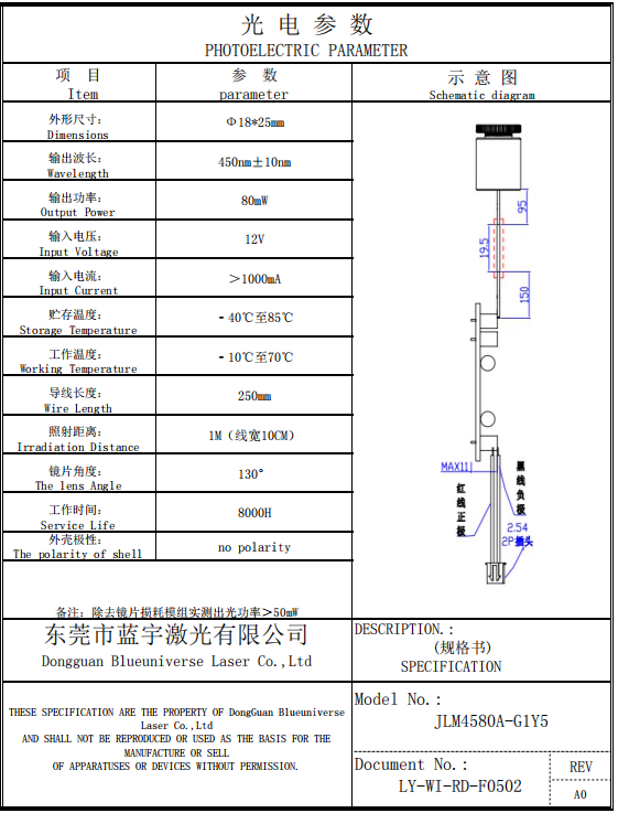 Featuring a compact outer dimension of Φ18×25mm, the module delivers a stable blue laser output at 450nmnm with an output power of 80mW. It operates on a 12V DC input voltage with an input current exceeding 1000mA, ensuring consistent energy supply for plant growth illumination needs. The laser emits a line-shaped beam with an irradiation distance of 1M (line width 10CM) and a lens angle of 130°, providing wide and uniform light coverage for plant canopies.