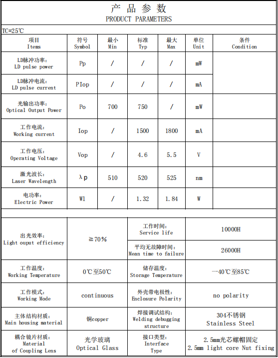 520nm 750mW fiber-coupled laser module has high efficiency, low current and low voltage. The coupling efficiency of fiber-coupled laser module can reach more than 70%, and the fiber core diameter is 105μm.