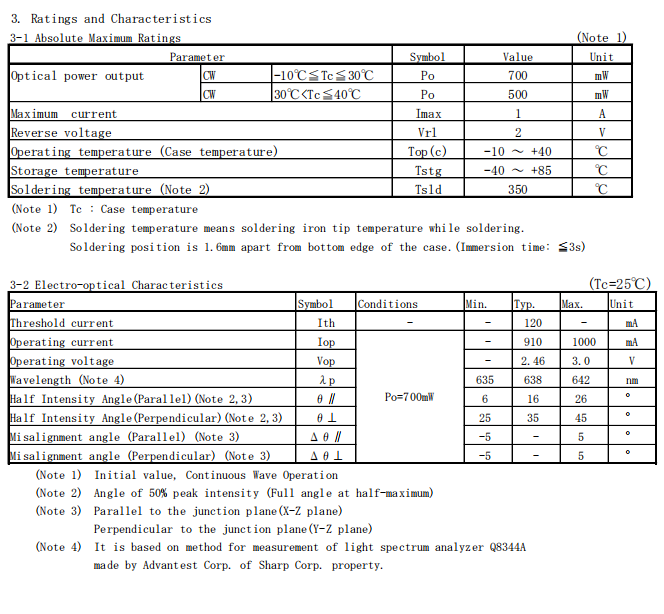 Built with SHARP’s precision engineering, this diode balances power and efficiency: it reaches a threshold current of 120mA (typical) and runs at a nominal 910mA operating current (at 700mW output), paired with a 2.38V (typical) operating voltage — minimizing power draw while maintaining consistent output. Its lasing wavelength centers at 638nm (ranging 635–642nm), ensuring bright, targeted red light emission.