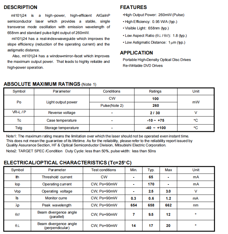 Designed for durability, the ML101J24P functions across a -10 to +75°C case temperature range and withstands -40 to +100°C during storage, with a 2V reverse voltage rating. It excels as a light source for portable high-density optical disc drives and re-writable DVD drives, combining Mitsubishi’s precision engineering with compact design and consistent, high-power performance.