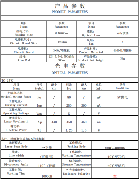 450nm 80mW one line laser modules are mostly used for indicating and positioning, laser aiming, medical treatment, detection and so on.