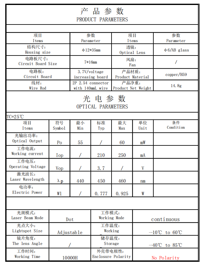 Note: This Focusable 450nm 60mW Blue Dot Laser Module emits visible blue light. Avoid prolonged direct eye contact, especially when using the focused small dot. Keep it away from children to prevent misuse.