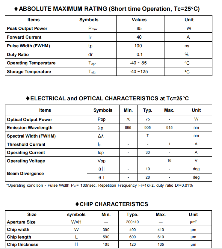 Built with quantum well engineering for efficiency and stability, this laser diode combines robust pulsed performance with reliable operation — perfectly suited for the demanding requirements of industrial sensing and automotive safety applications.