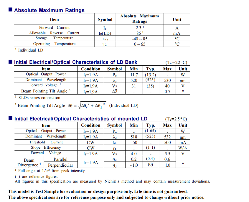 - Performance: Delivers a typical 13.2W total optical output power (CW operation at 1.9A), with a dominant wavelength of 525nm (range: 510–530nm) for bright, consistent green light.