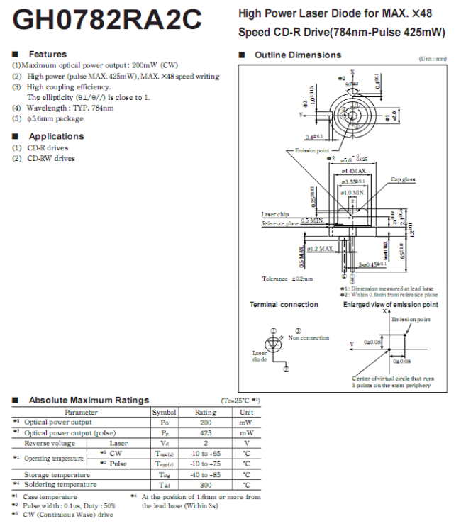 The SHARP GH0782RA2C is a high-performance 784nm laser diode, engineered to deliver robust power and reliability for high-speed optical storage applications. Operating at a typical 784nm wavelength, it provides a steady 200mW continuous-wave (CW) optical output — with a peak pulsed output of up to 425mW (ideal for MAX. ×48 speed CD-R/CD-RW writing), making it a top choice for CD drives and rewritable CD systems.