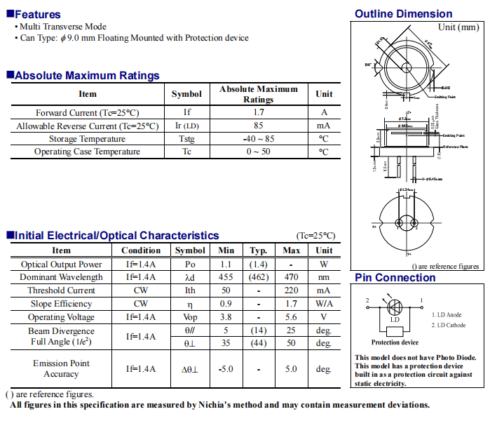 Nichia TO9mm Pcakage 462nm 1.4W Blue Laser Diode