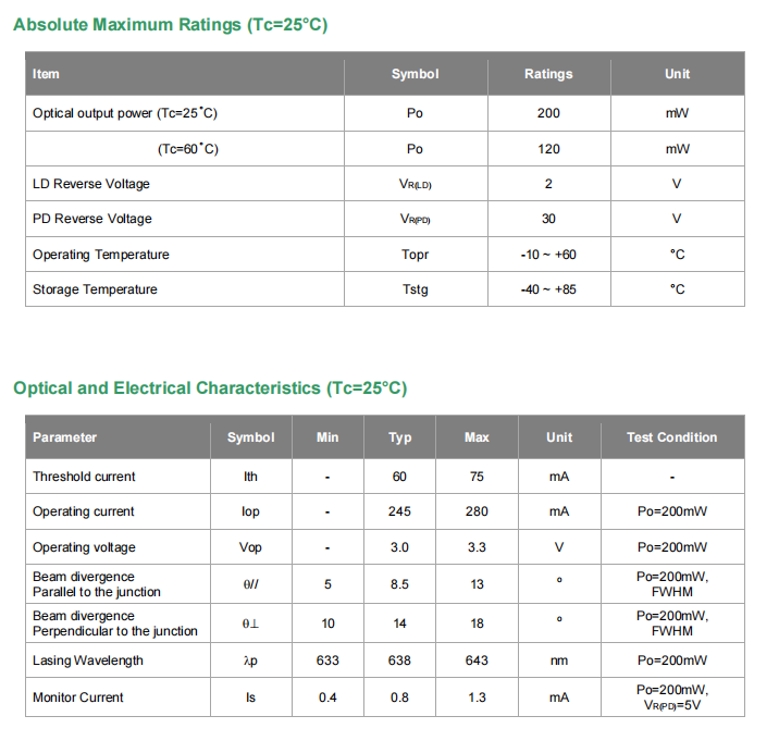 - Optical Characteristics: Emits bright 638nm light (wavelength range: 633–643nm) in a single transverse (TE mode) oscillation, ensuring consistent, high-quality beam propagation. Its beam divergence is tightly controlled (typical 8.5° parallel, 14° perpendicular to the junction, FWHM).